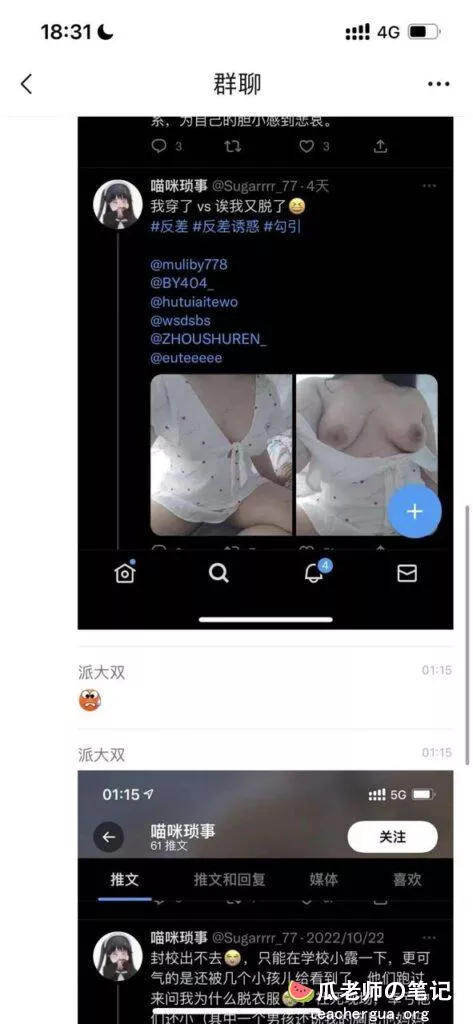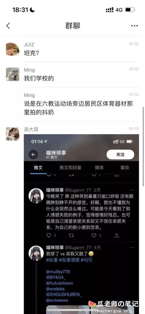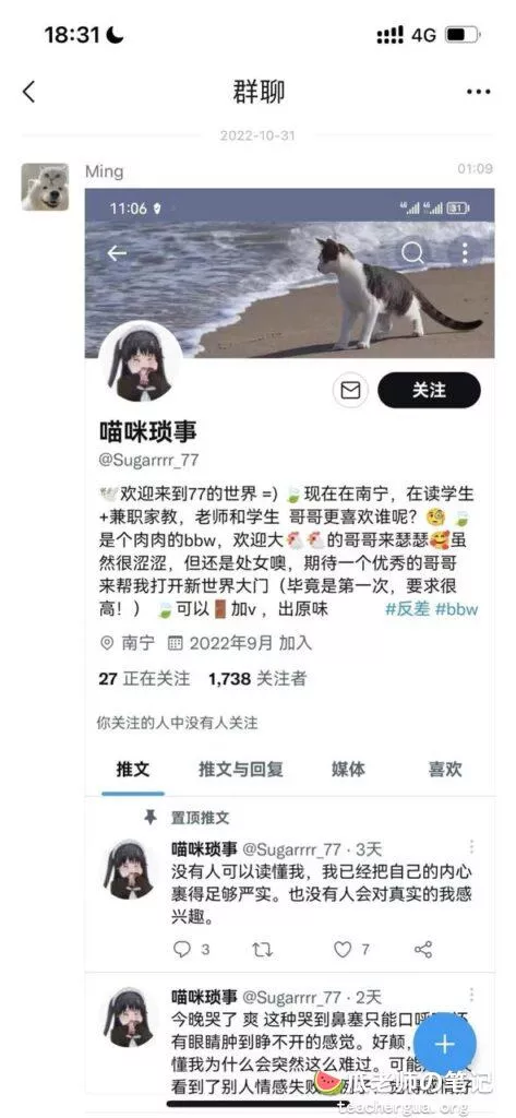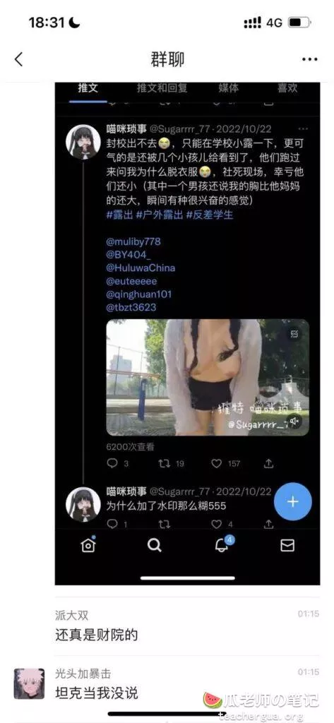 原推特名称猫咪琐事,长期玩露出和各种play,在更新了几个教室内和Cao场露出后,被广西财经学院的学生发现就是自家学校,多次对比之后,终于发现这位福利姬就是本校在校学生。