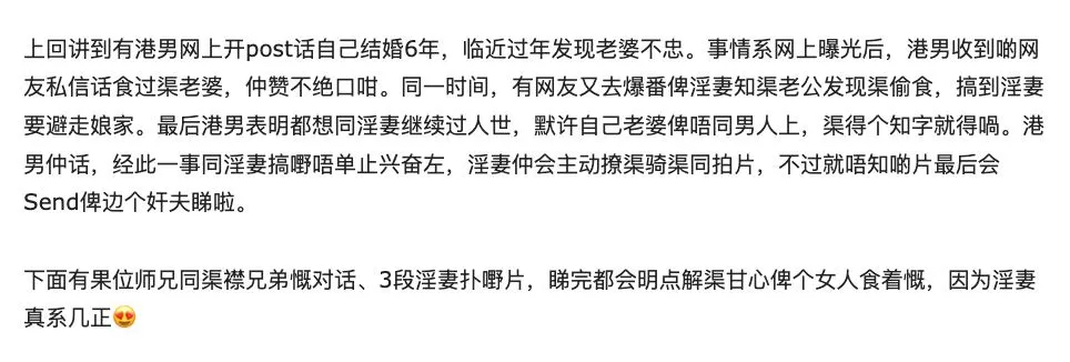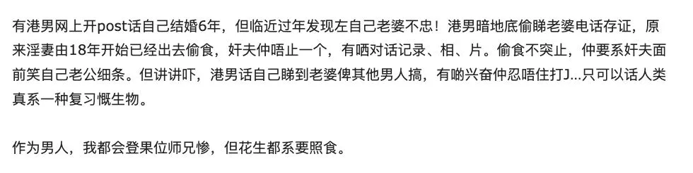 在香港,一名男子在论坛上爆料称,他与妻子的六年婚姻中充满了谎言。他揭露,从2018年开始,妻子便在外出轨,这也意味着他们长达六年的婚姻同样伴随着六年的不忠。更令人震惊的是,有网友在评论中回应,曾与该男子的妻子同床共枕,这一消息令他倍感痛心,犹如当头一棒。