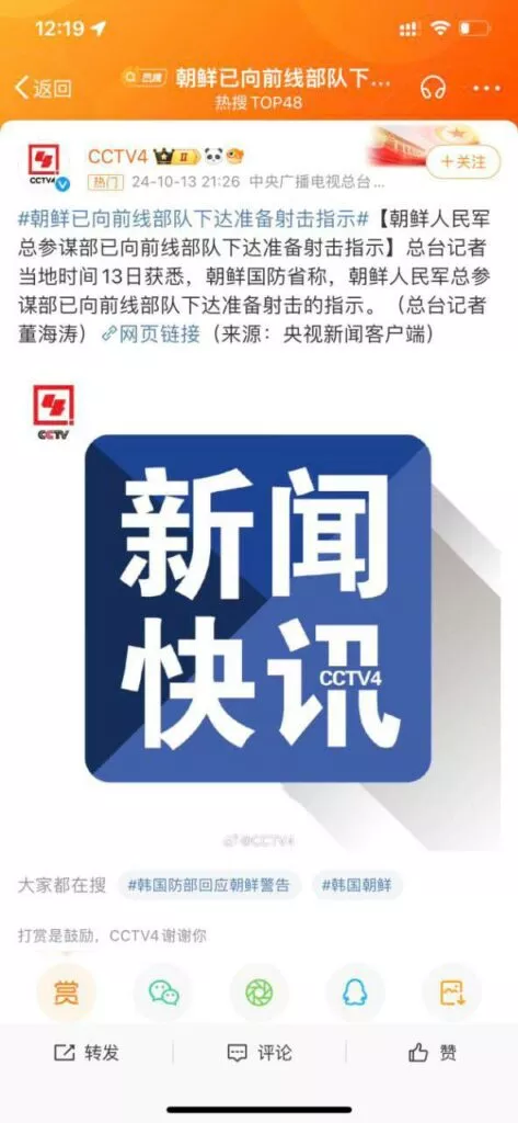 10月13日晚,朝鲜国防省宣布,朝鲜军队总参谋部已对前线部队发出射击准备命令,以应对韩国近期的明显挑衅行为。对此,韩国方面回应称,韩军并未向朝鲜发射无人机。韩国联合参谋本部的一位相关人士指出,亟需确认无人机是否由韩国民间团体发射。