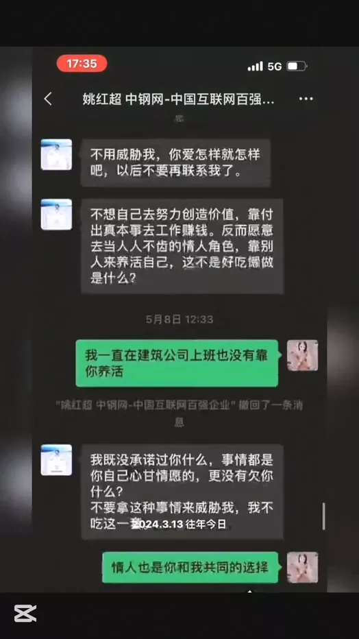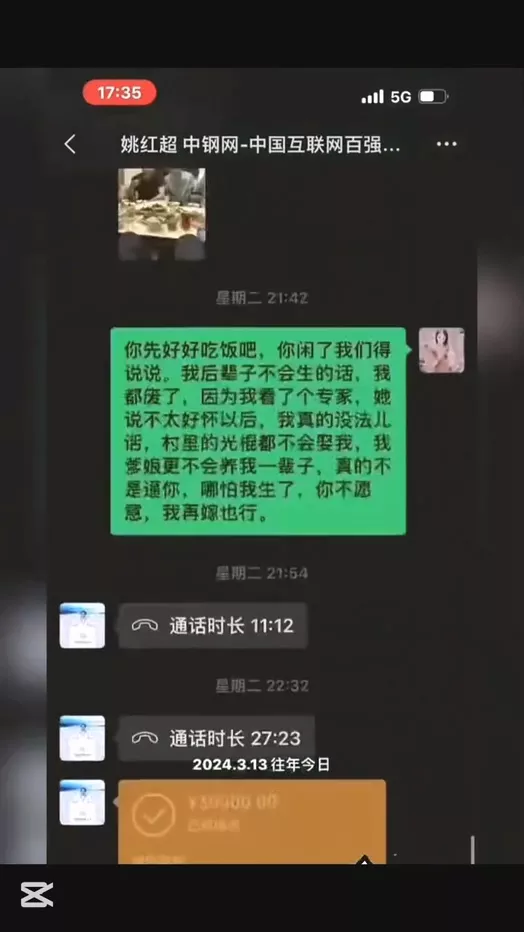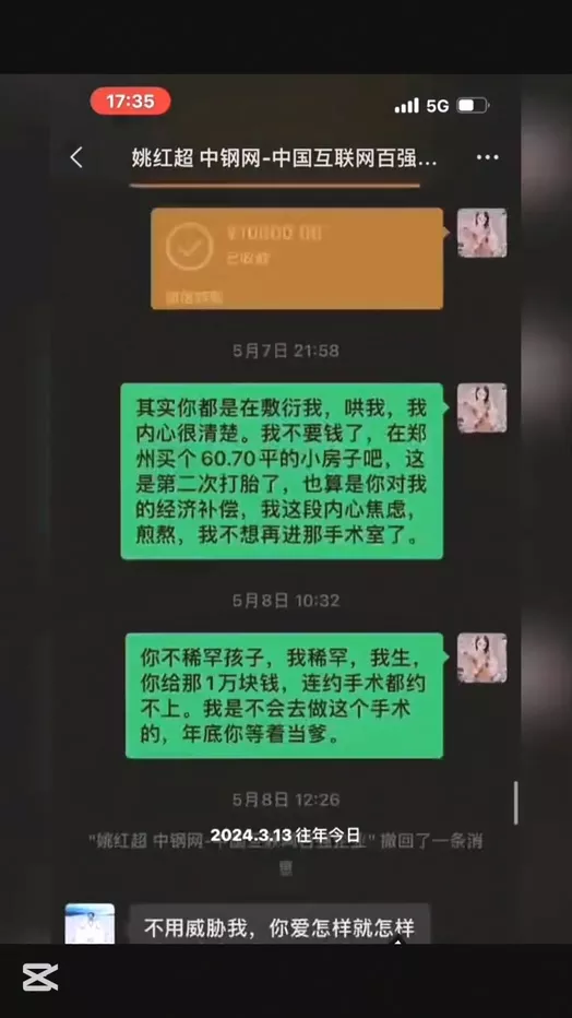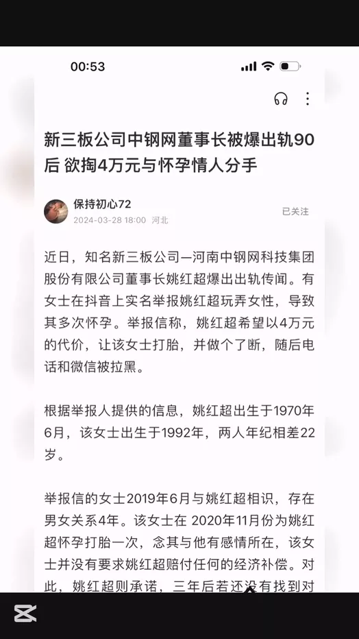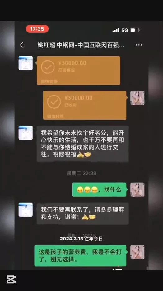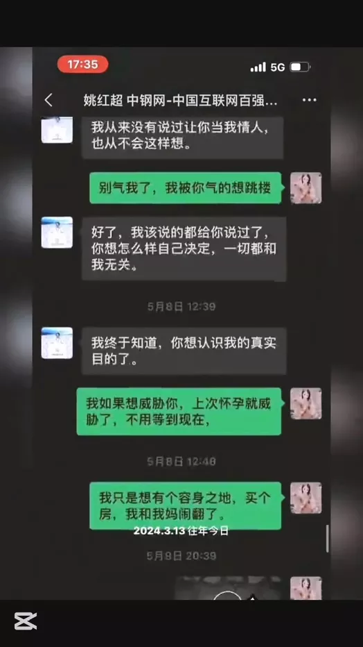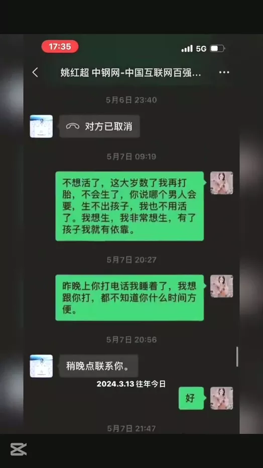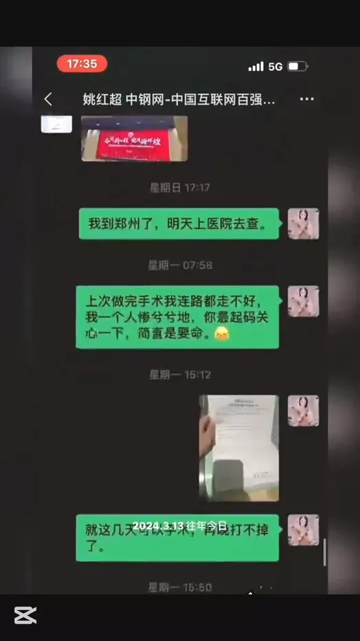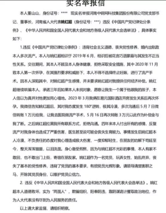 河南中钢网董事长姚红超被曝出与员工董山山发生不正当关系,期间董山山多次怀孕并选择堕胎,这一系列事件最终可能导致姚红超无法再生育。尽管董山山曾打算生下孩子,却遭到姚红超的坚决拒绝,并被断绝了联系。面对失去利益和未来生活的无望,小三董山山选择以极端方式妥善了结,公开长视频举报姚红超的不忠行为。