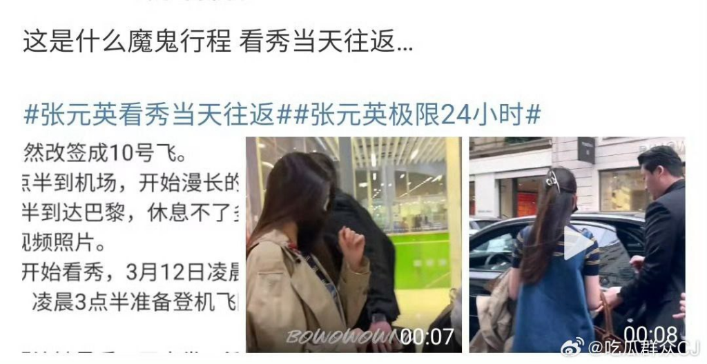 首先,微博在前几日出现一个话题名为张元英看秀当天往返的超话,大致就是张元英在12日凌晨到巴黎参加展会,又在当天回到韩国。然后谢广军的女儿谢安迪,作为张元英的粉丝,发出如下评论,感叹偶像的辛苦。