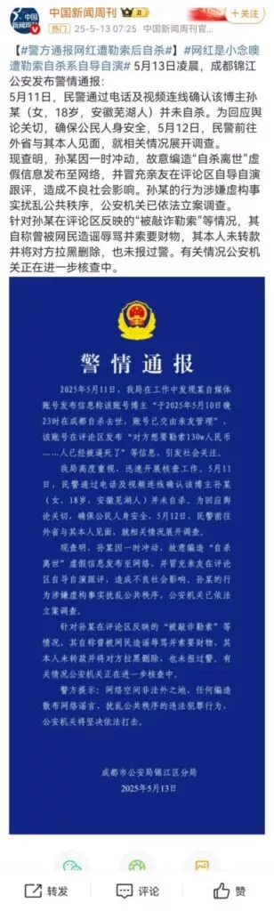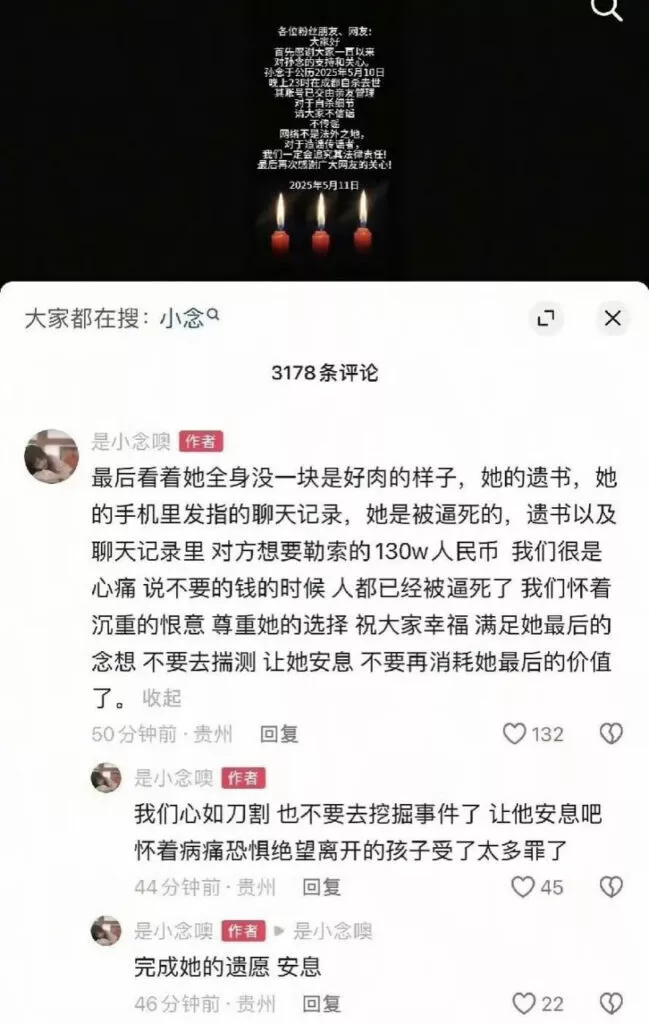 拥有150万粉丝的抖音网红小念近日发布自我讣告,称因勒索自杀。警方调查发现她“安然无恙”,该信息为虚假。亲友评论也疑似是她自导的。目前,她的账号已被封禁,警方已立案调查。