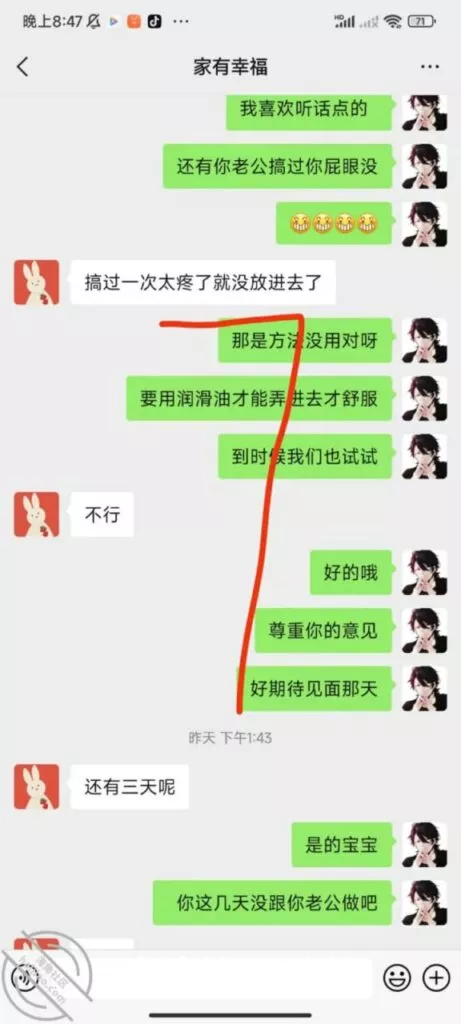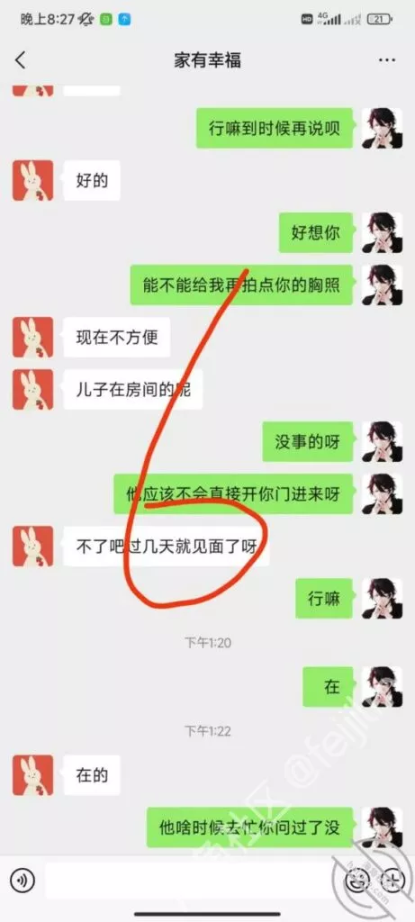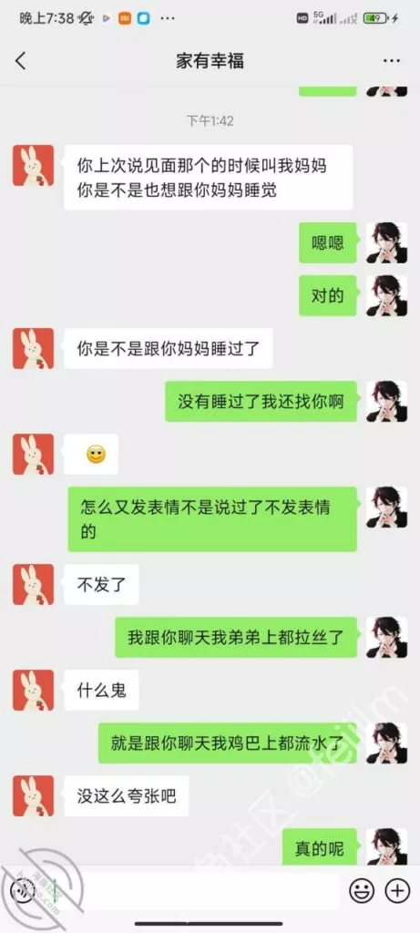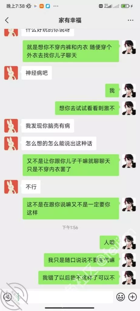 前几天跟妈妈聊天    我让他不穿内衣内裤去跟他儿子聊天  结果 他很反感 两天没理我    不知道什么情况我也也一直 在 跟妈妈 做工作 . 可是始终还是行不通 每次 提到母子错乱关系 他就避而不谈   不肯深究     我昨天  说再不回信息就删了 他 他  隔了几分钟 就回我了   应该也是对我这个陌生人感兴趣了  不过 他不知道的是 我这个陌生人是他儿子假扮的     不过     今天下午聊天  得到了 一个好消息   明天再给兄弟们更新吧