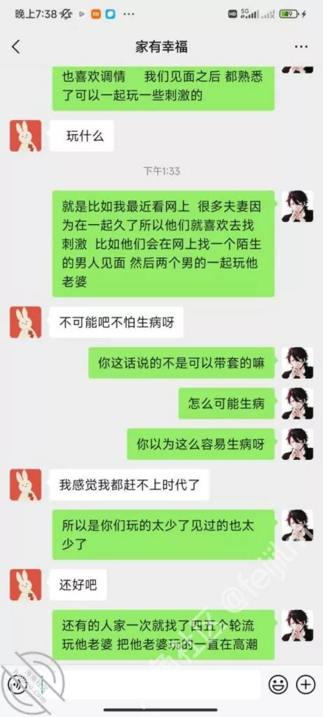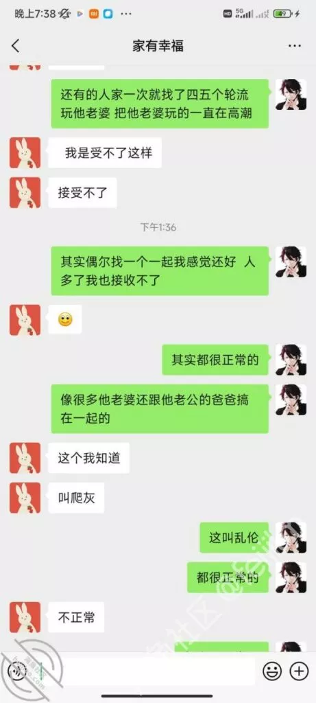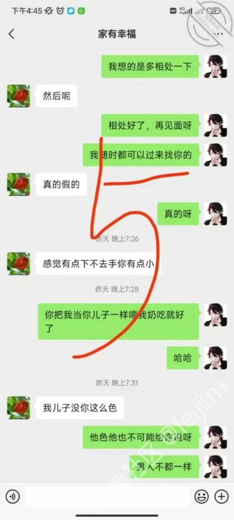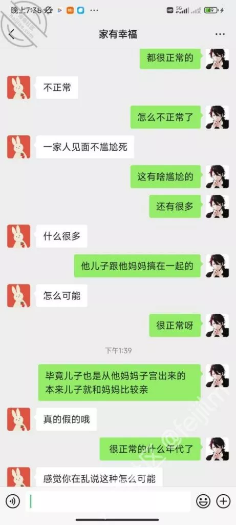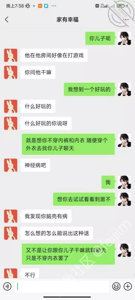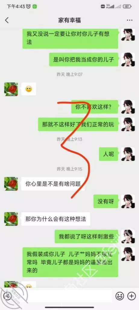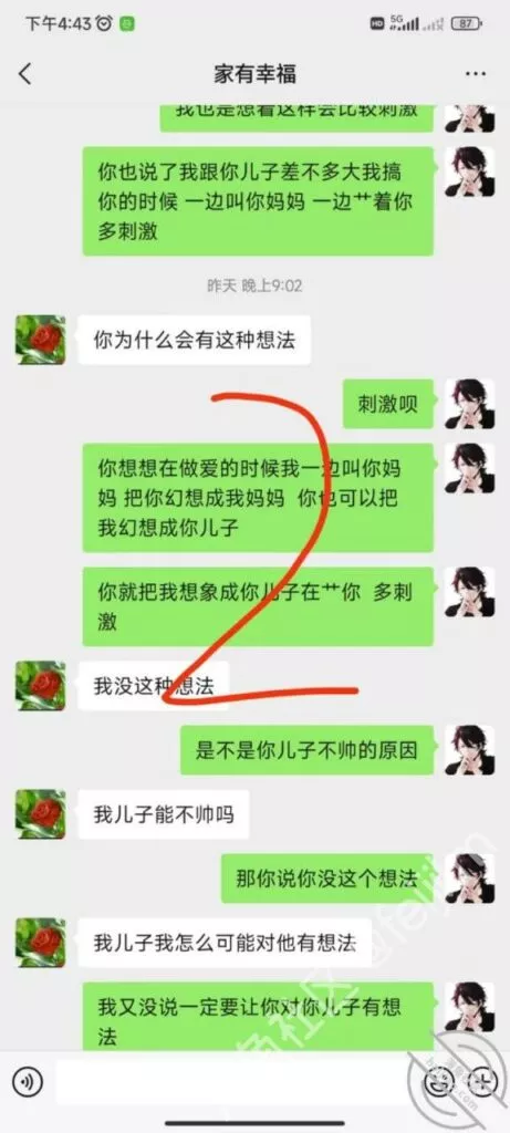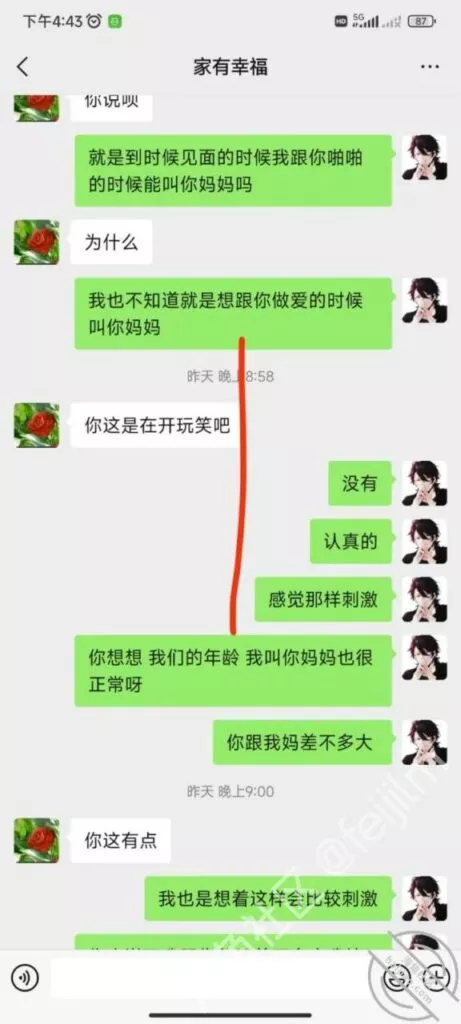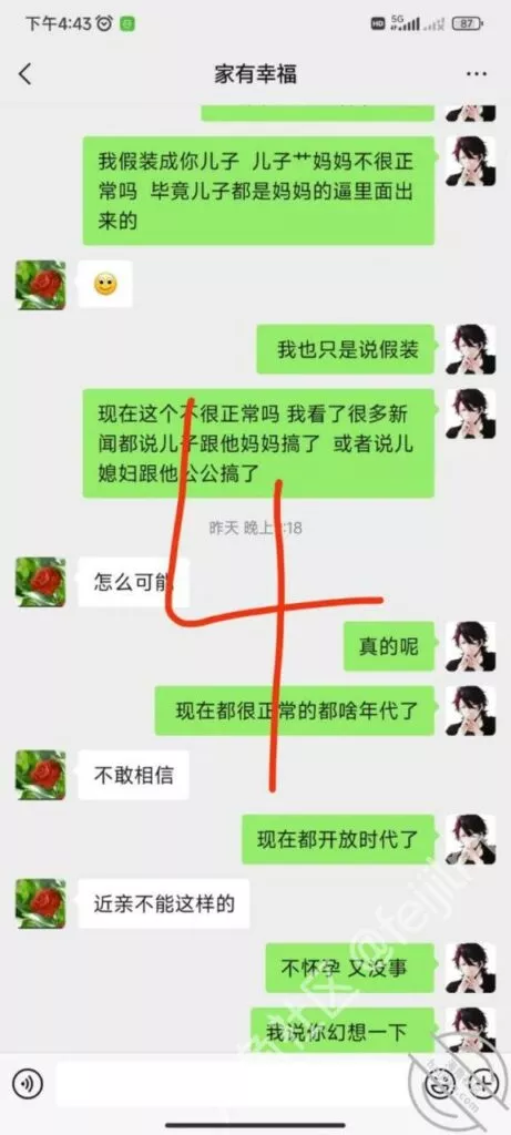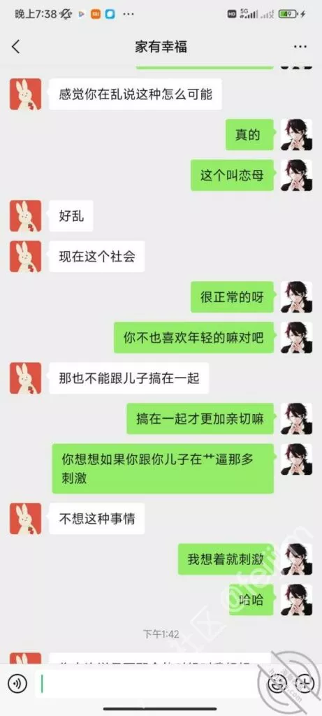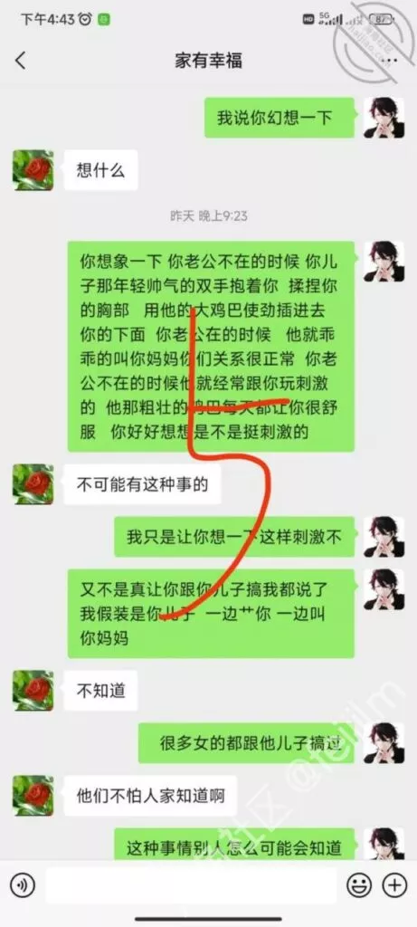 昨天假装陌生人 跟妈妈聊天  我说能不能 见面的时候  一边艹他的搔B 一边叫他 妈妈      他很不理解 看的出来 因为年龄的差距 他们那一辈人还是比较墨守成规   不过是种逃不出他那一刻想出轨的心    感觉说到最后吧 他也没啥好反驳我的     其实如果我不是他的 儿子 我早就把它艹 了    一直没行动是因为 我不知道怎么去坦白 跟他说我是他儿子    我也看了 以前的  帖子评论区   也采纳了  有些网友的建议  尝试着  让他接受错乱关系    多给他讲讲错乱关系的 事情是很正常的   不过总是说到关键点他就发了个微笑的表情 让我不敢再继续说下去    大家看看聊天记录  评论区也可以发表下你们的意见   谢谢