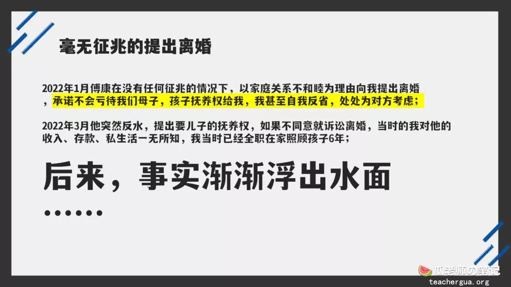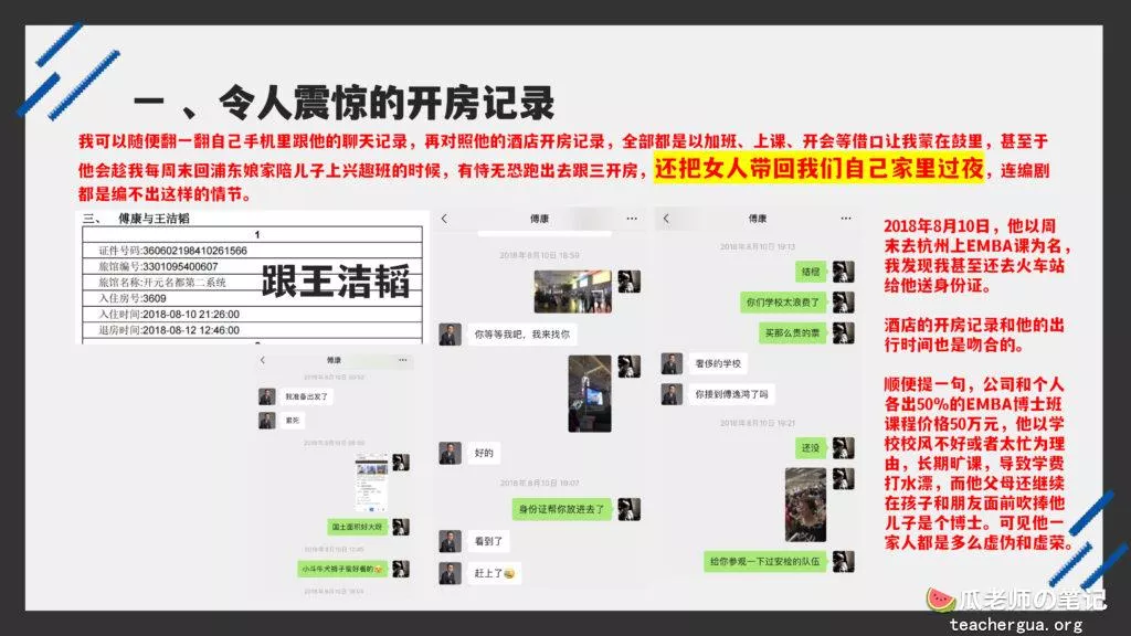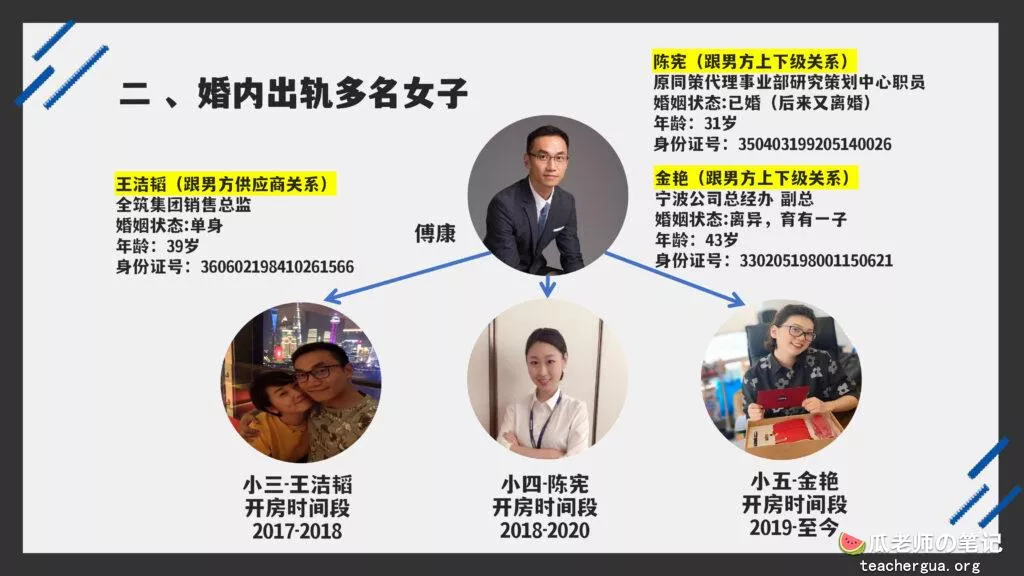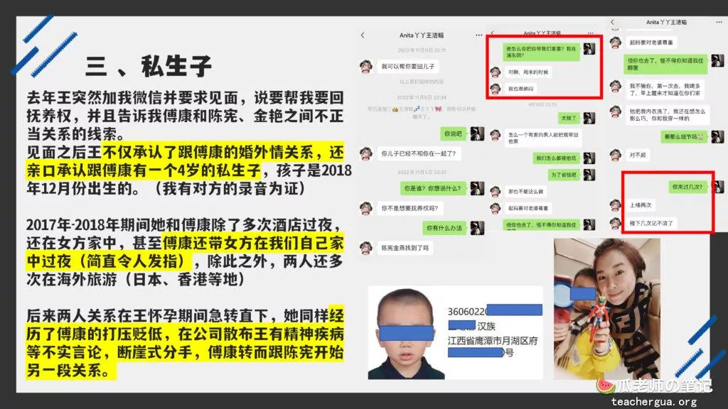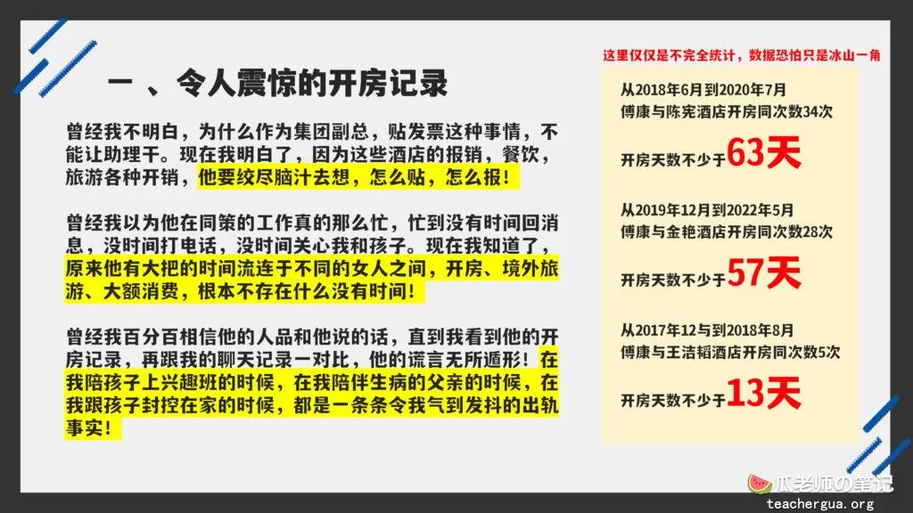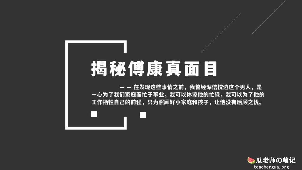 这次的PPT门事件更为震撼,把这位傅康渣男称为人渣已经算是赞美了,真是猪狗不如啊,长期出轨多人还有了私生子,谎称自己有抑郁症把妻子蒙在鼓里,然后暗地里转移资产,最终害的妻子流离失所。详细的内容各位瓜友慢慢啃吧,瓜老师啃这个瓜是带着润滑油一起啃的。