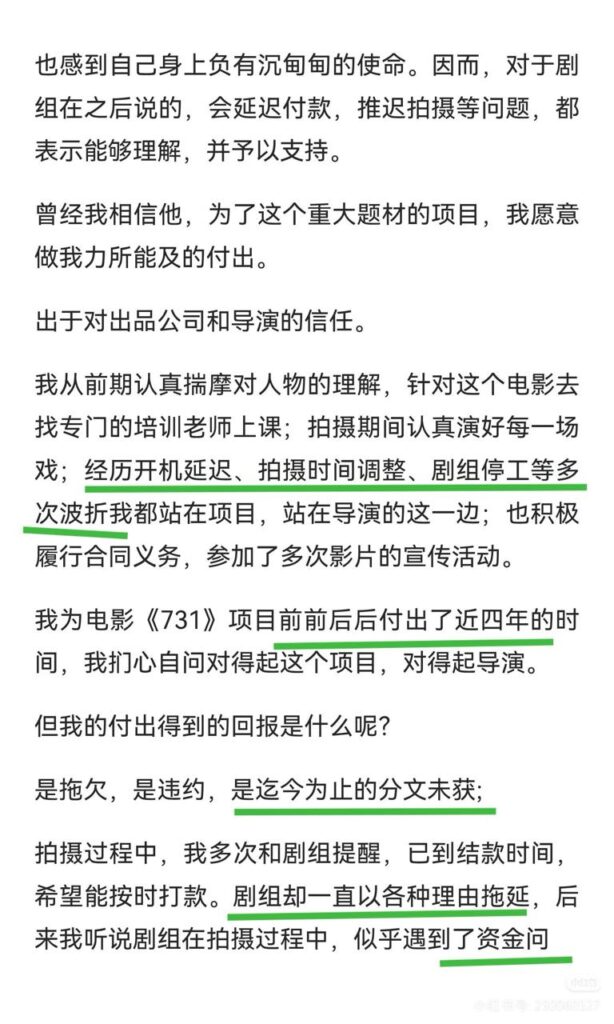 内地电影《731》演员王尊,突然发文指责《731》剧组多次欠薪,其本人声称,在电影拍摄阶段,剧组曾多次遇到停工以及资金问题,是他始终支持导演赵林山完成这部电影,没想到换来的却是被除名以及高达70万元的薪资欠款。