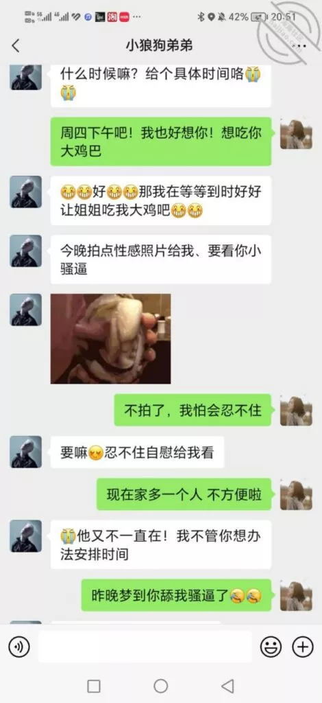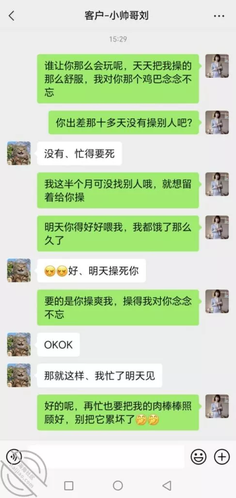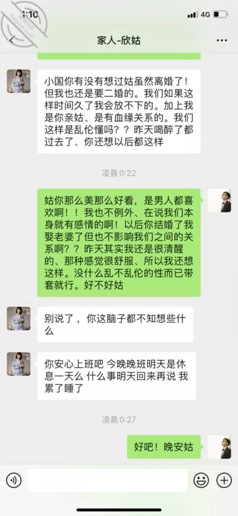 姑姑绝B搔B,昨晚喝醉三更半夜才回来。手机没拿上去就睡着了。记得以前拿她手机问过密码,尝试了一下还真打开了没改密码。翻看下她的聊天记录发现了不得了东西,手机上最少有四五个暧昧聊天对象.最牛B的是和一个小狼狗弟弟的聊天记录。真他娘的搔.看完聊天记录直接硬了起来真想上楼称她醉酒把她歼了。和人家发果聊还吃大JB的话语.还约了周四去打炮。观信息以前都是来她住的地方的,现在我来了影响到她了。我该不该找个借口说周四要上一天班然后半路偷偷杀回来呢??哈哈…想想都刺激。我把她的聊天记录的照片保存下来发给各位看这搔娘们。