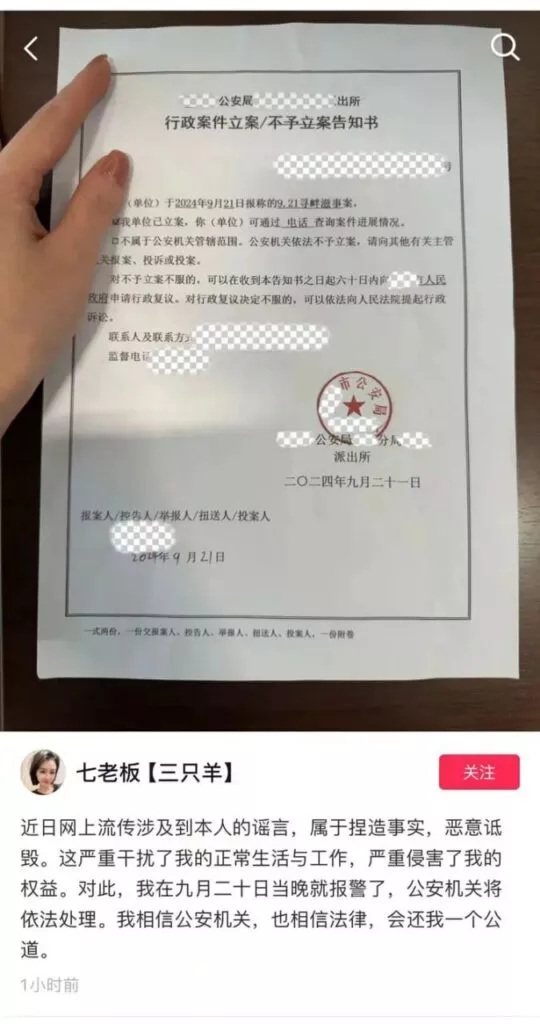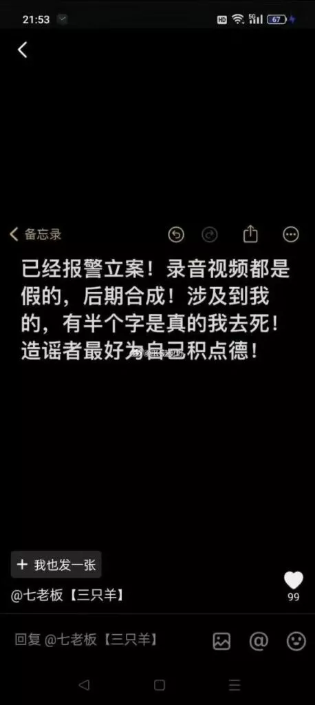 在此事之前,多名旗下主播包括大杨嫂第一时间发声为卢文庆站台作证录音为ai合成,甚至三只羊旗下几位头部女主播发文已经就此事报警。七老板更是发了一张报警回执单。